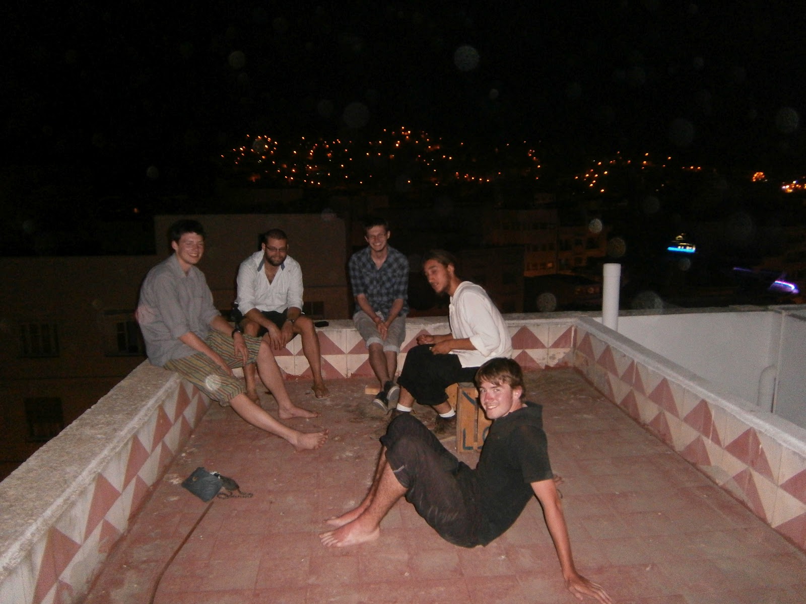 The beach itself was rather strange as the male:female ratio was around 100:1, with the blonde population consisting of just me and Pete. We hung around for a whlile regardless until we turned our eyes to the colour of Pete's feet and decided that that was enough sun for one day. The walk home was punctuated with a brief, but baffeling stop for mint tea. We went in (again, not a woman in site), drunk our tea, tried to pay and eventually gave up. Even now, i cant work out why we werent allowed to give them any money, but Pete suggested that maybe we were followed in by a large group of Morocan men following my hair, so the owners let us off the tea as thanks for all the extra buisness. ha ha! Later we went to a sandwhich shop, where my only way of communicating was to hand over what i guessed a sandwhich would cost and point to everything and see what they produced. It seemed to work pretty well and i was even given change.